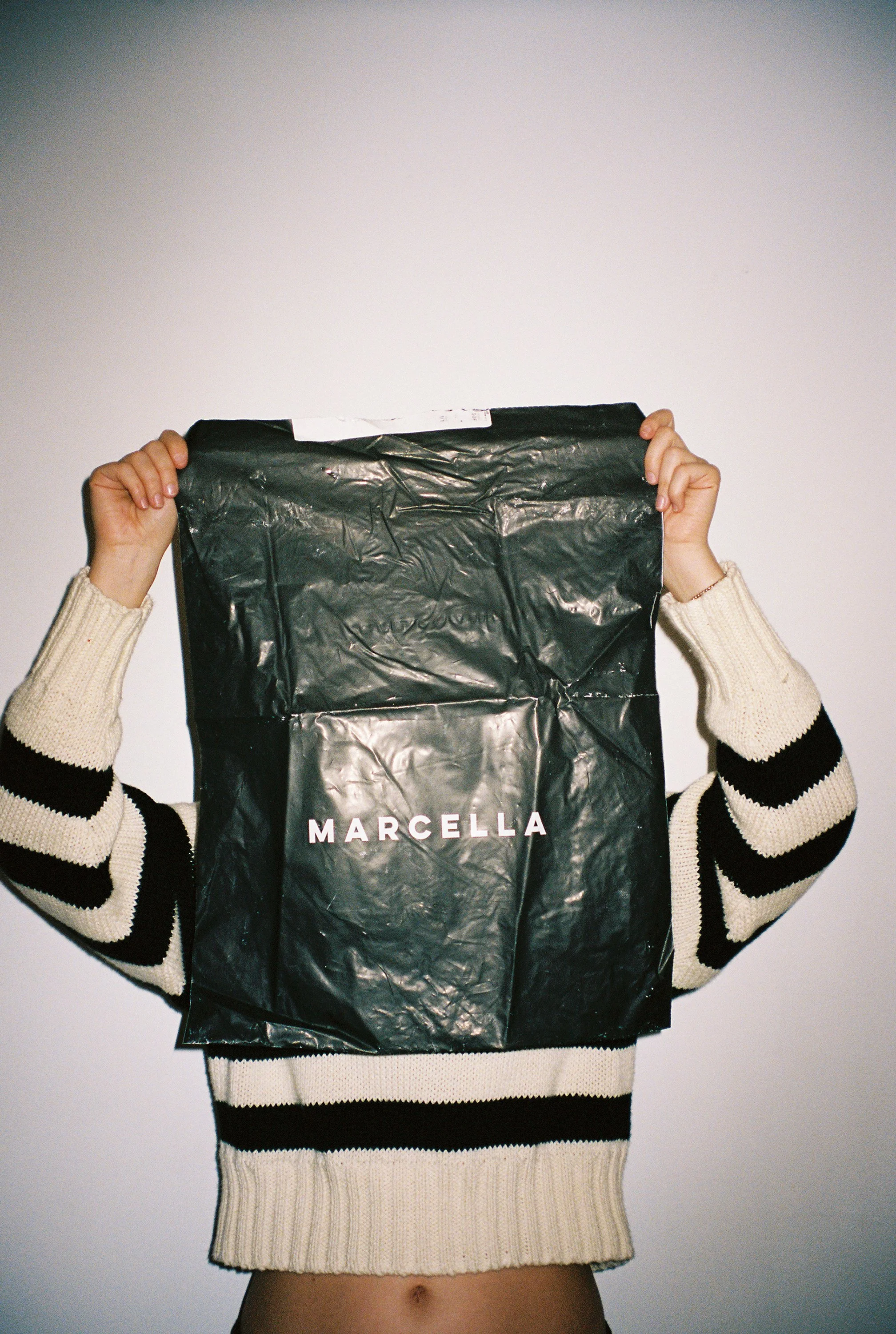 Person holding a black plastic shopping bag with the name 'MARCELLA' written on it, obscuring their face. The person is wearing a cream and black striped sweater.