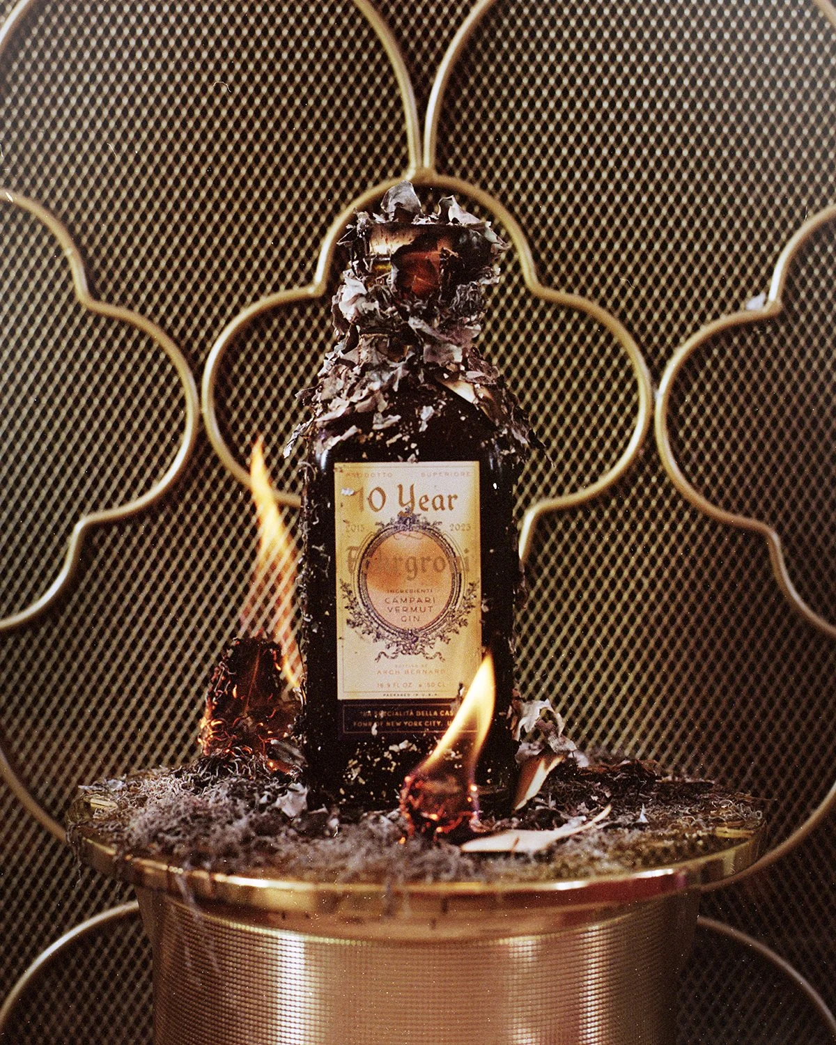Close-up of a product label celebrating 10 years of Fohrgoni gin, featuring ornate blue and pink design elements, with text indicating ingredients as Campari, vermouth, and gin, and bottles bottled by Arch Bernard.