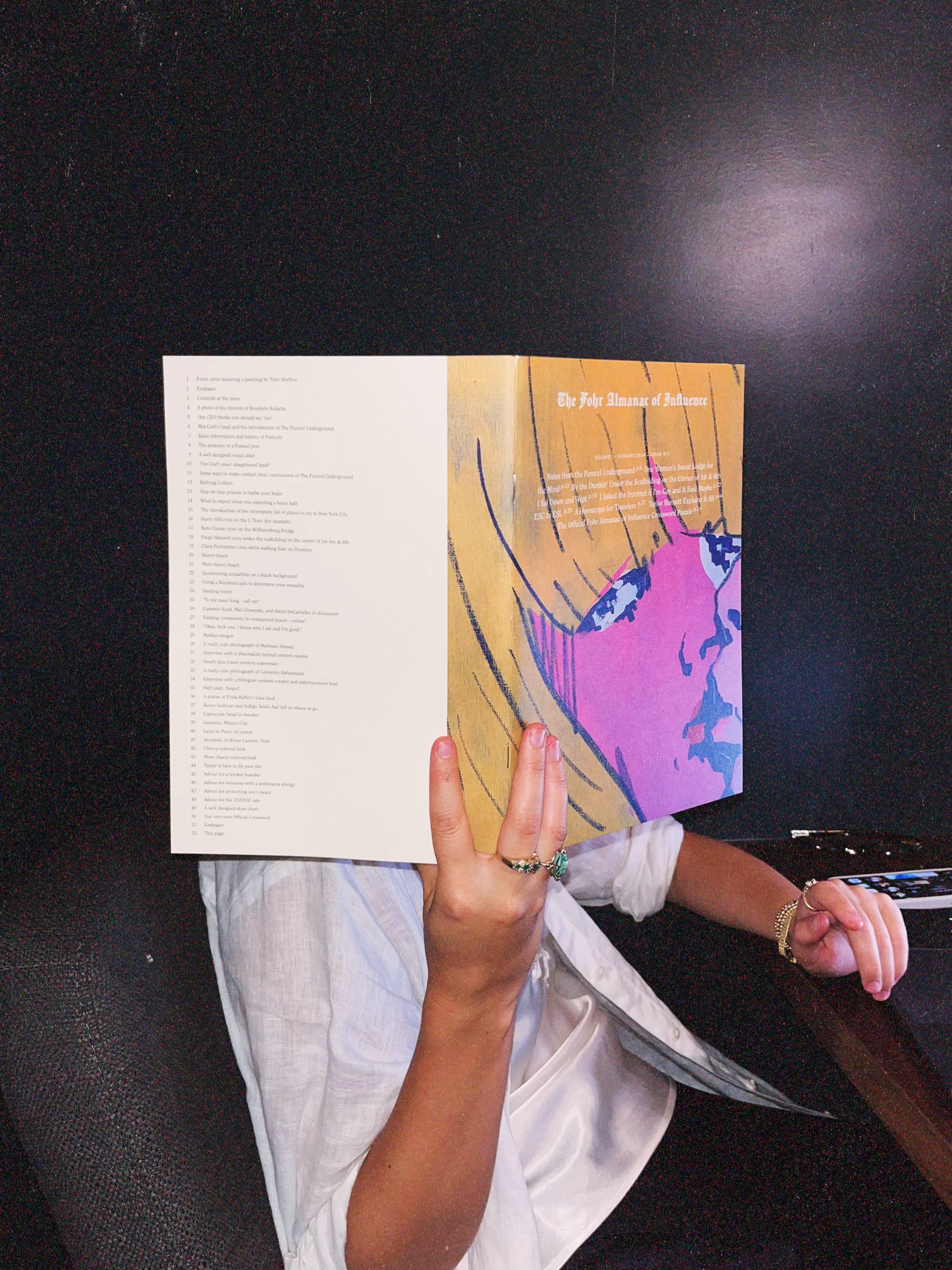 Person holding a yellow newsletter titled 'The Fohr Almanac of Influence' inside a vehicle; another person in the background also holding a copy.