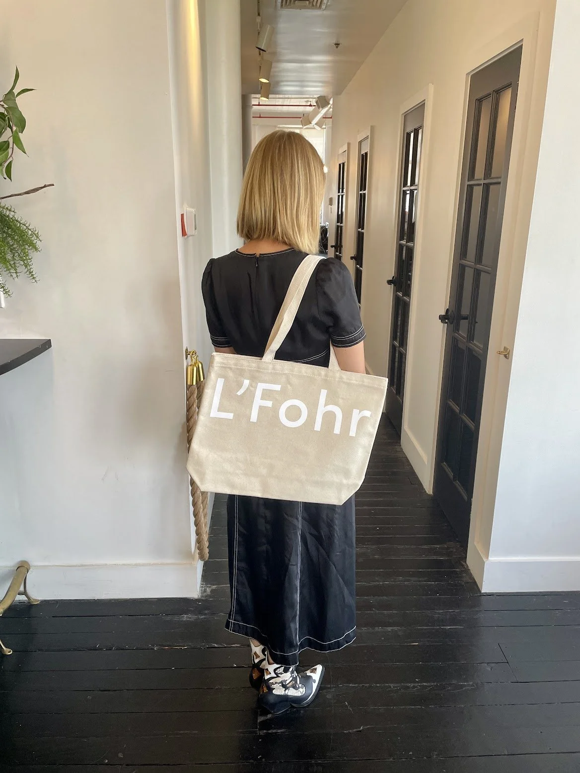 A woman with blonde hair wearing a black dress, carrying a beige tote bag with the words 'L'Fohr' printed on it, standing in a hallway with black wooden floors and white walls, near a white wall with some greenery.