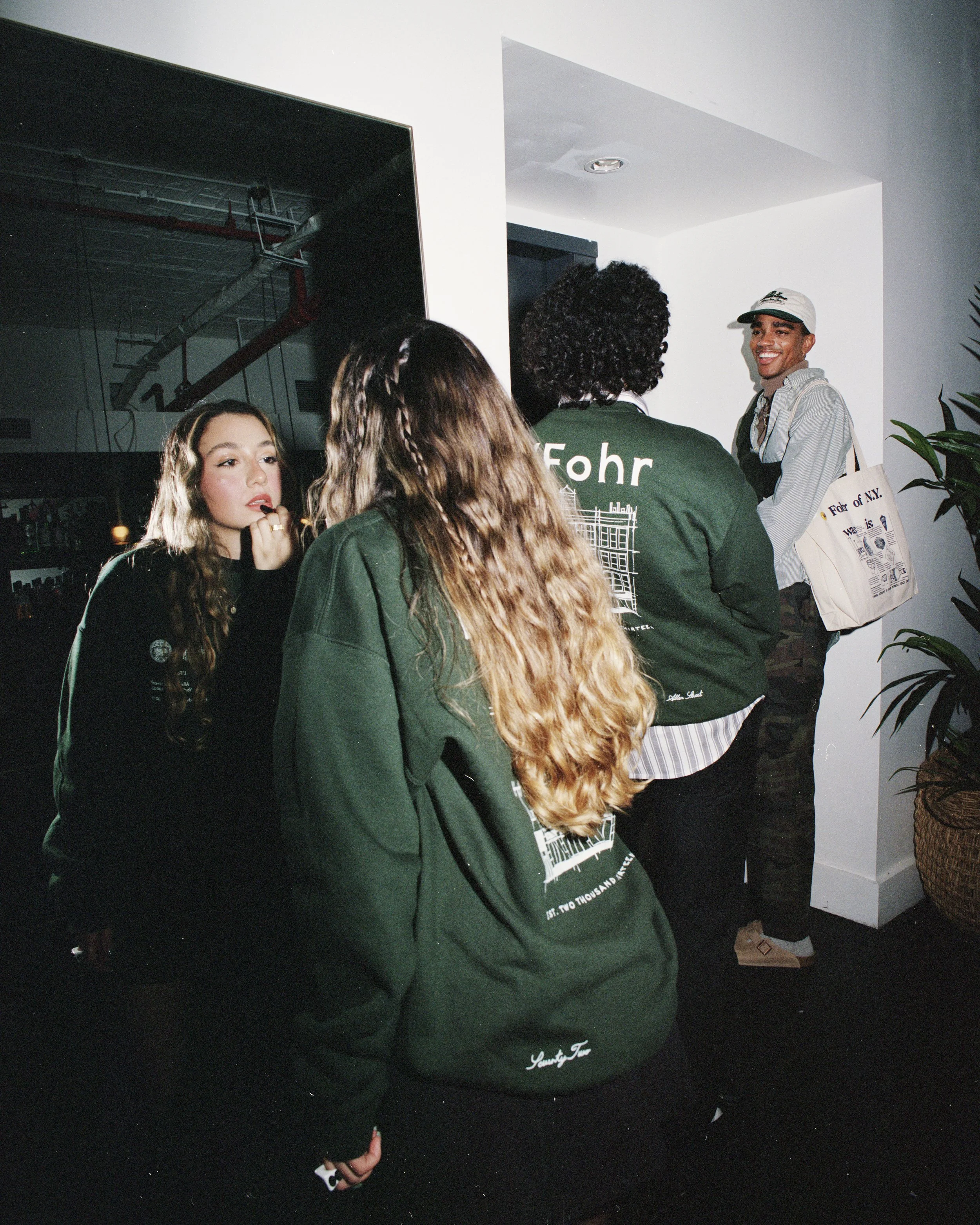 Close-up of a dark fabric bag with a white label reading 'FOHR' and 'New York City United States', along with Latin phrases.