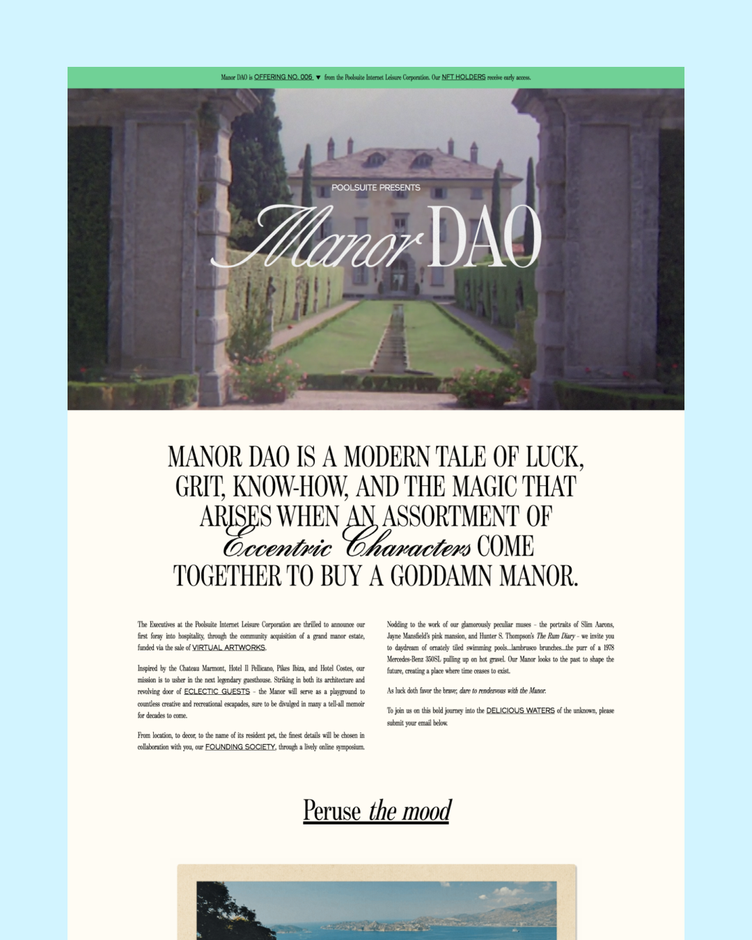 A webpage promoting Manor DAO with a large image of a grand estate and lush manicured gardens, along with text describing the project and its features.