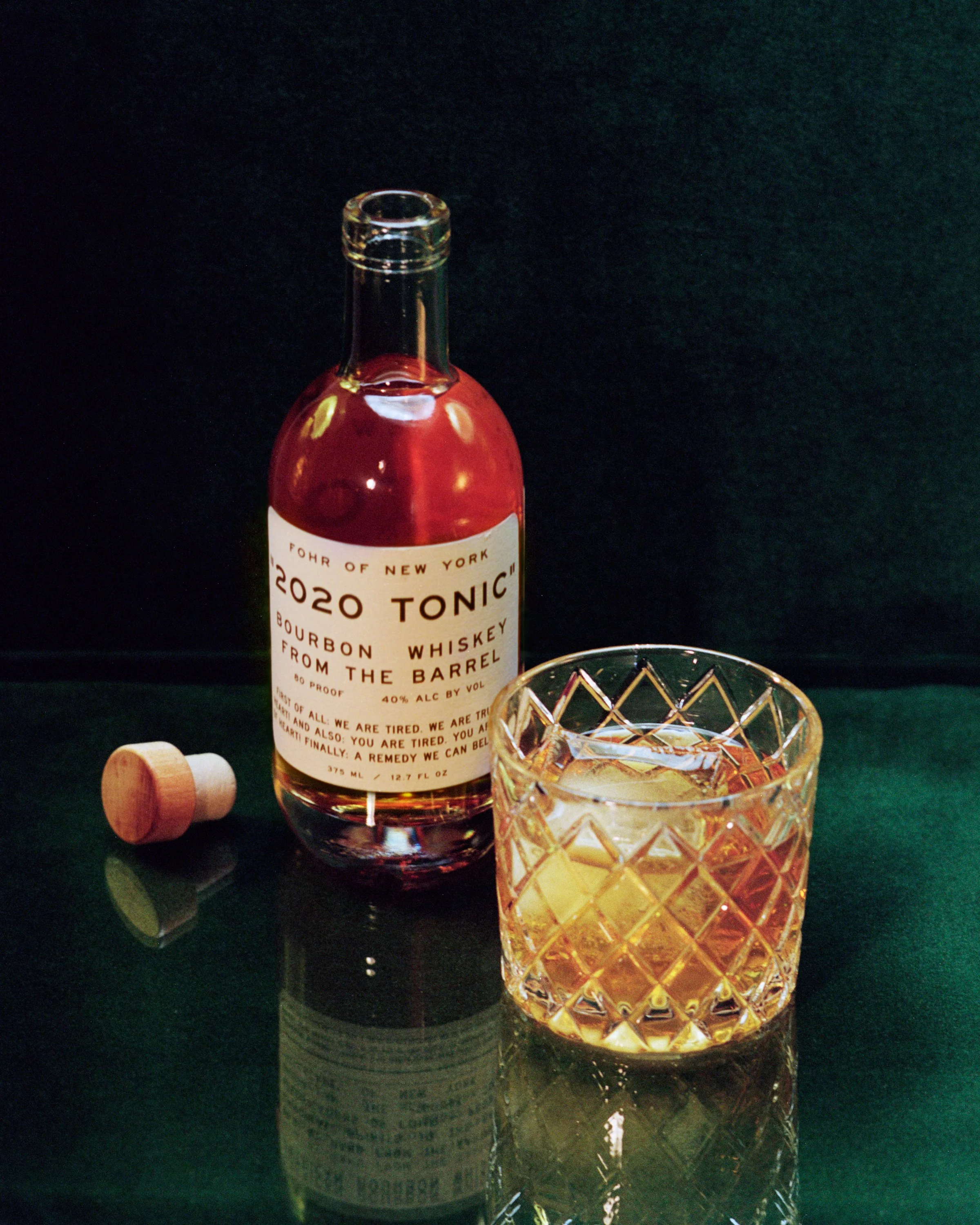 A bottle of bourbon whiskey labeled '2020 Tonic' with a glass of whiskey on a textured green surface.