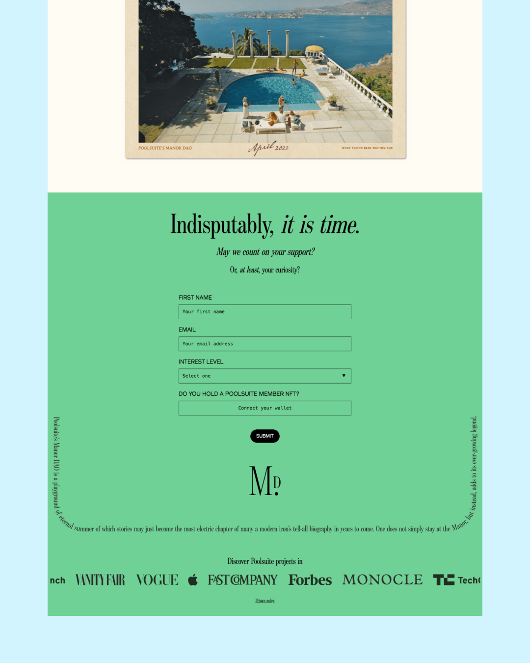 A webpage with a photo of a swimming pool area overlooking the ocean. The page has a green background with black text and a form for support, with logos of various media outlets at the bottom.