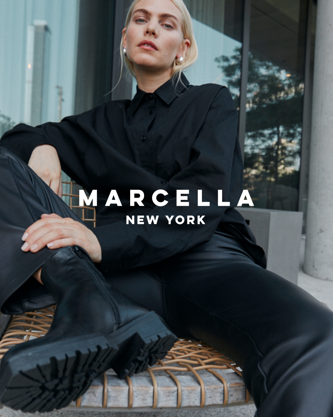 A woman in black clothing and boots sitting on a bench outside a modern building in New York, with text 'Marcella New York' overlayed.