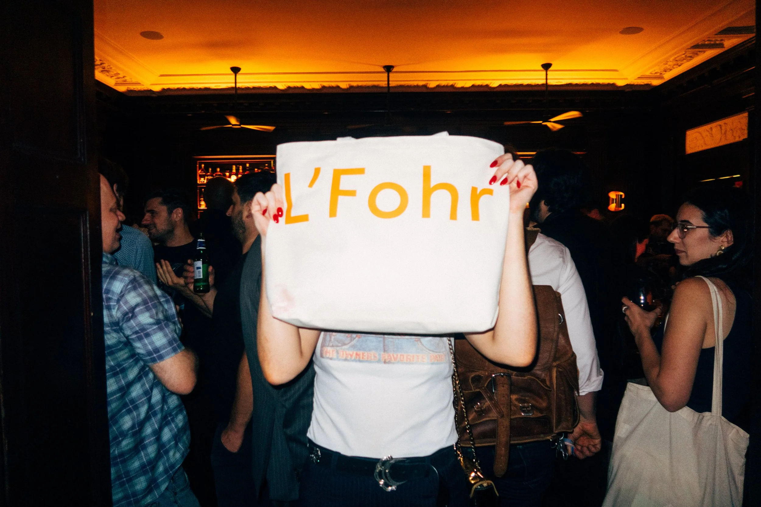 Person holding a sign with yellow and orange text that says 'L'Fohr' in a dimly lit bar or party scene with people socializing in the background.