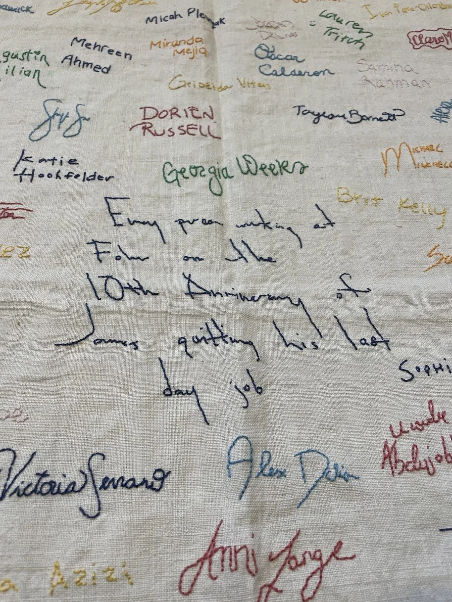 A fabric with handwritten names and messages in various colors, including a note celebrating a 10th anniversary.