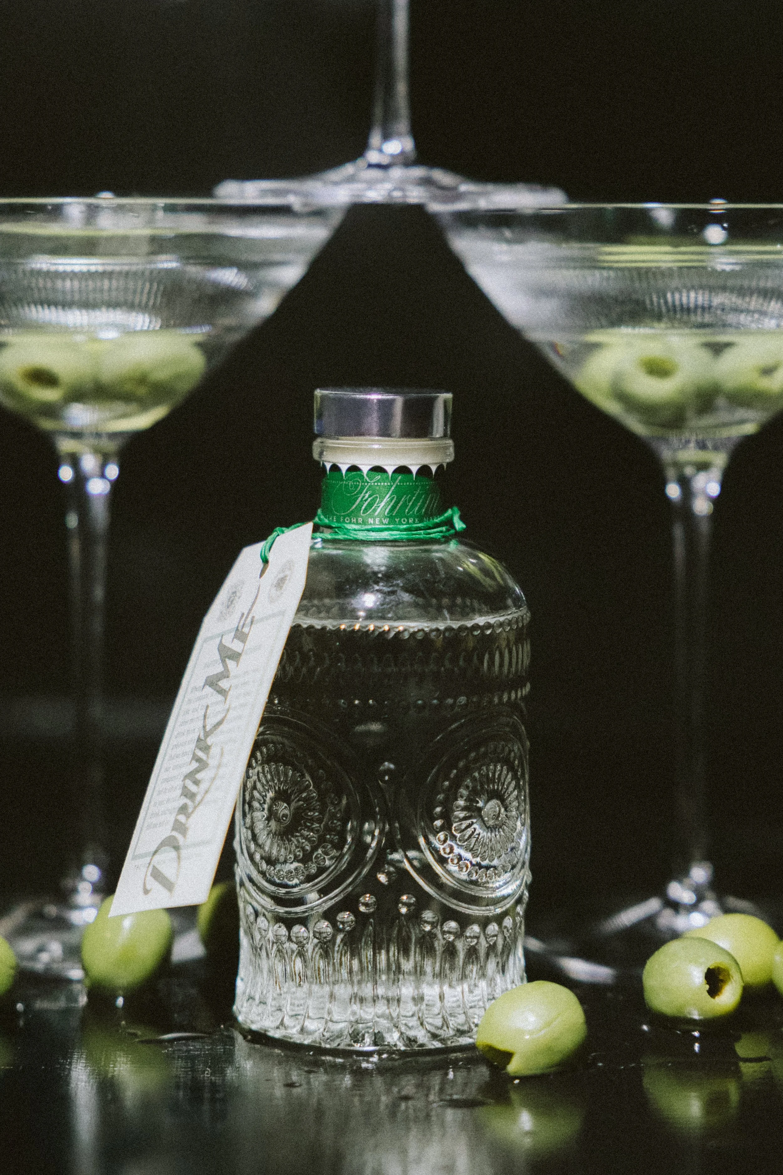 A glass bottle, 'FOHRTINI' surrounded by two martini glasses filled with olives and scattered olives on a black surface with a black background.