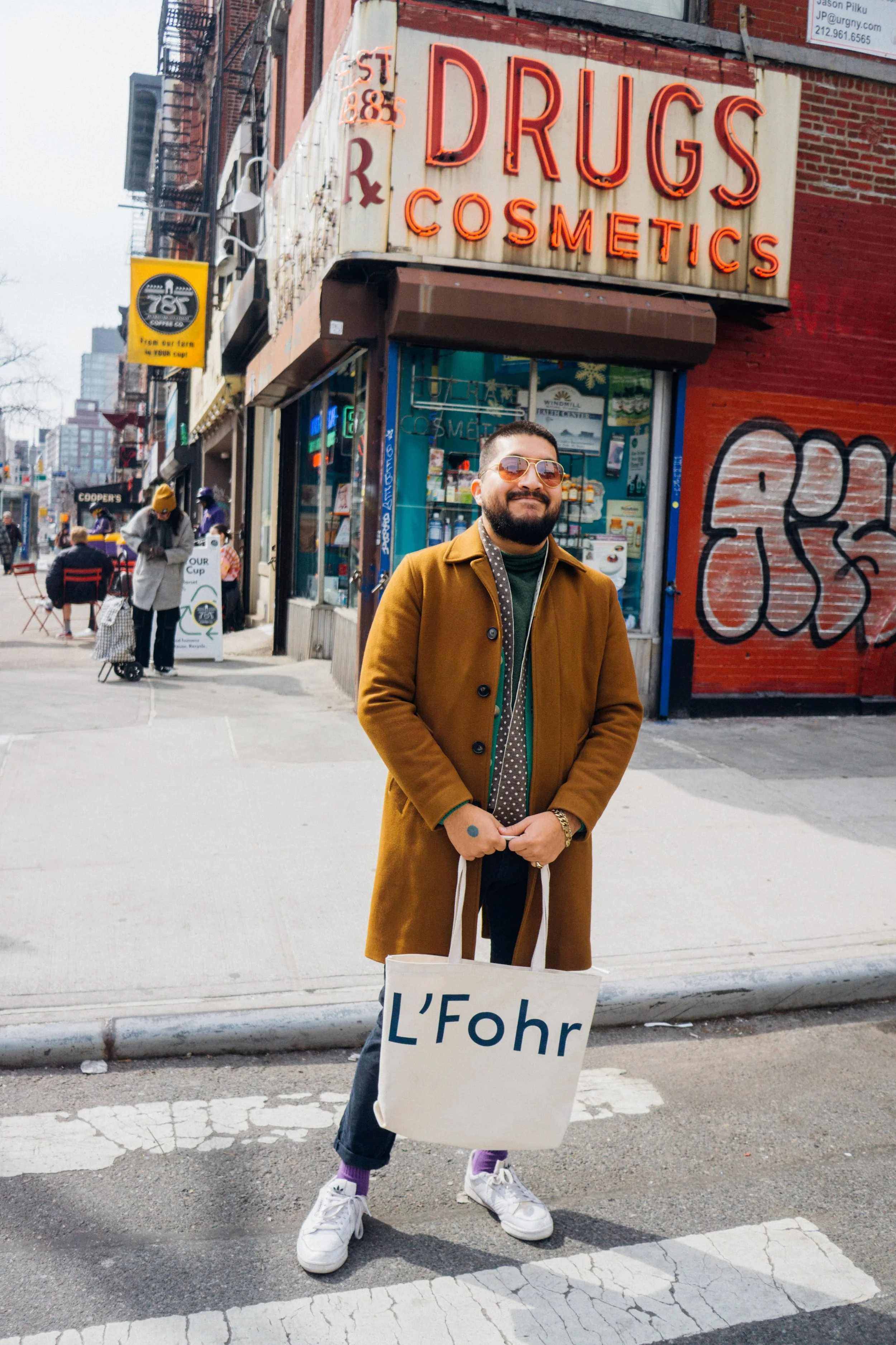 A man with sunglasses, a beard, and a brown coat holding a tote bag with the text "L'Fahr" standing on a crosswalk in front of a store with a sign that says "DRUGS COSMETICS." Several people are walking or sitting outside the store on a city street,