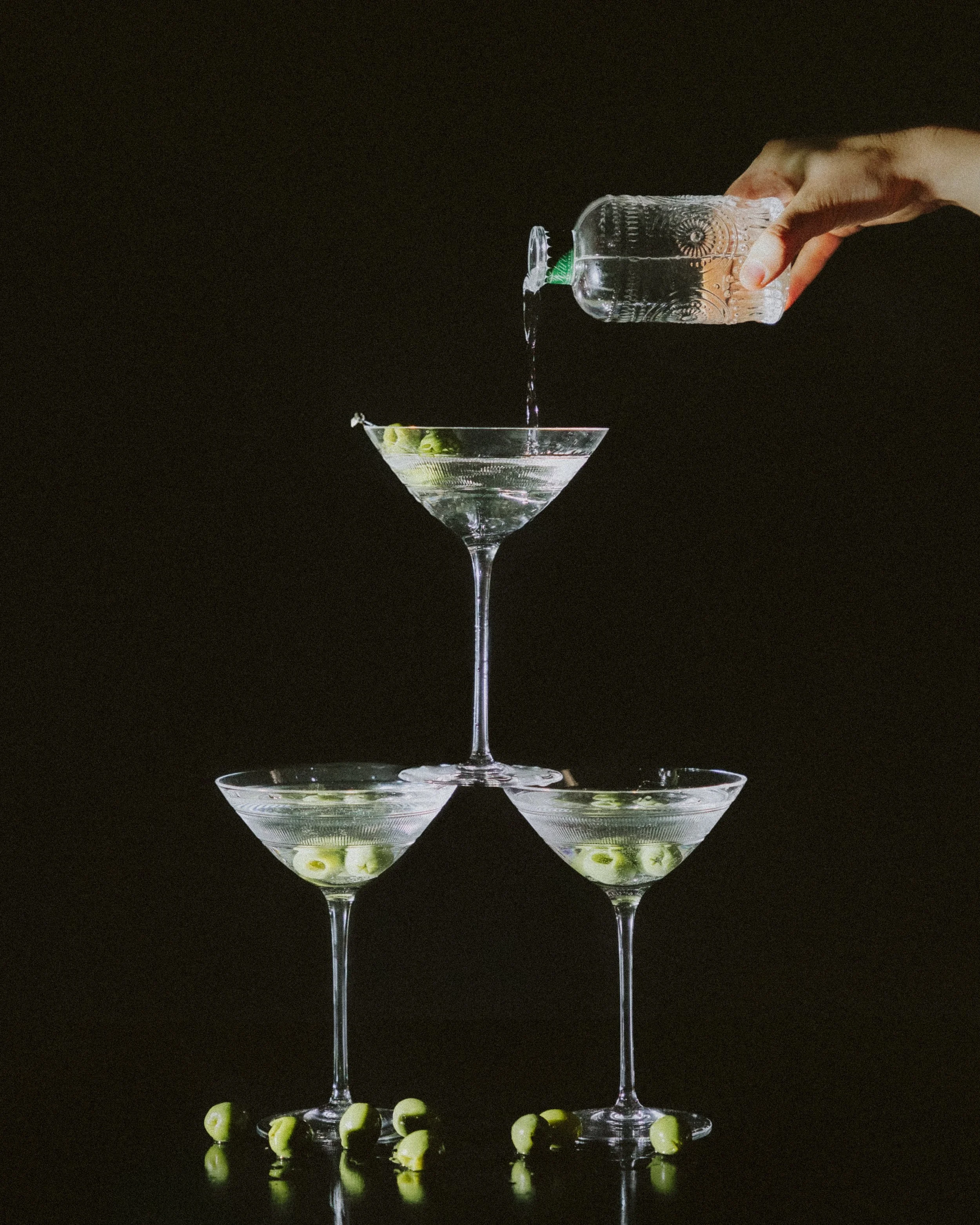 A pyramid of four cocktail glasses with olives inside, and a hand pouring a clear liquid into the top glass from a plastic bottle.
