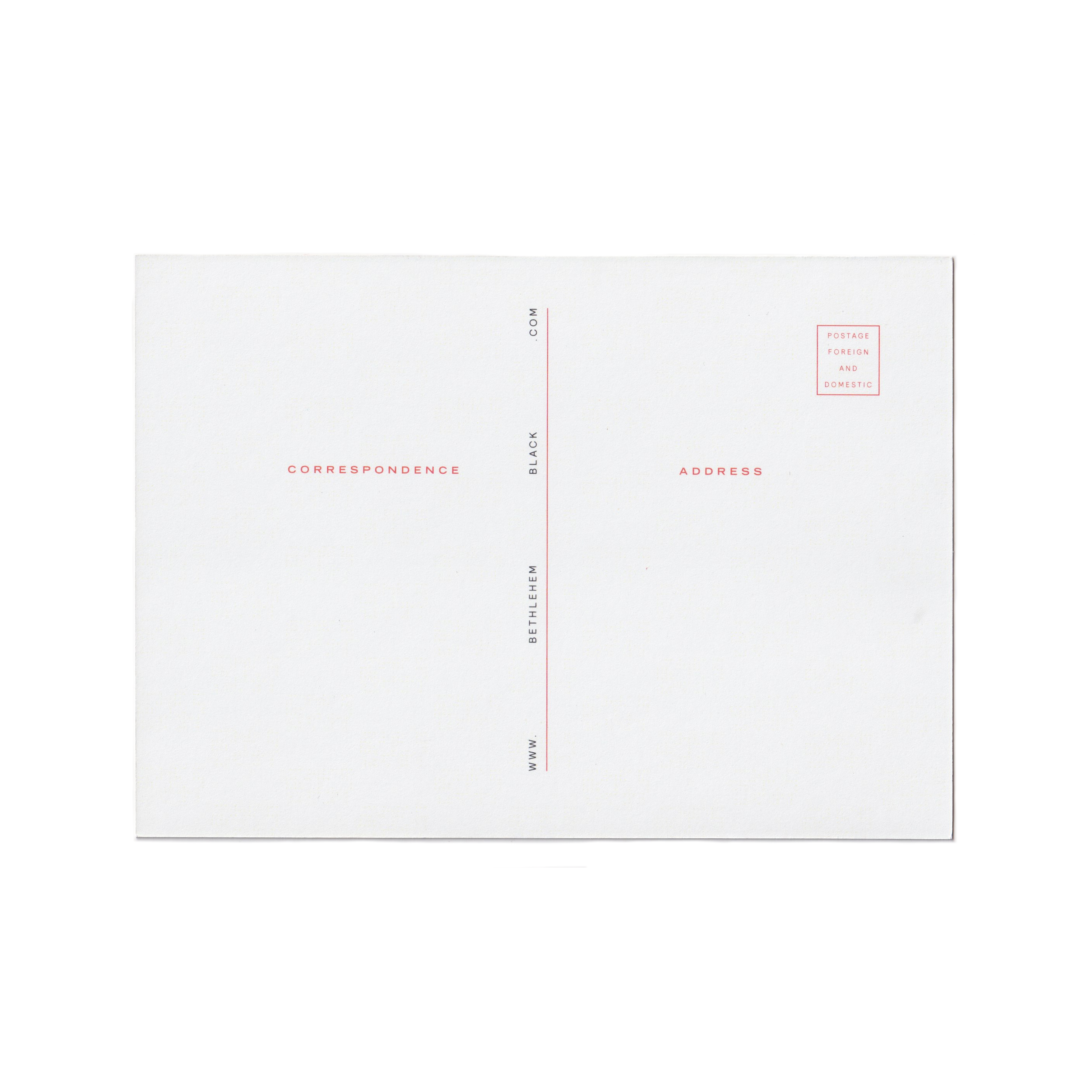 White postcard with red and black text divided by a red vertical line, labeled "Correspondence" on the left and "Address" on the right, with space for a stamp and address.