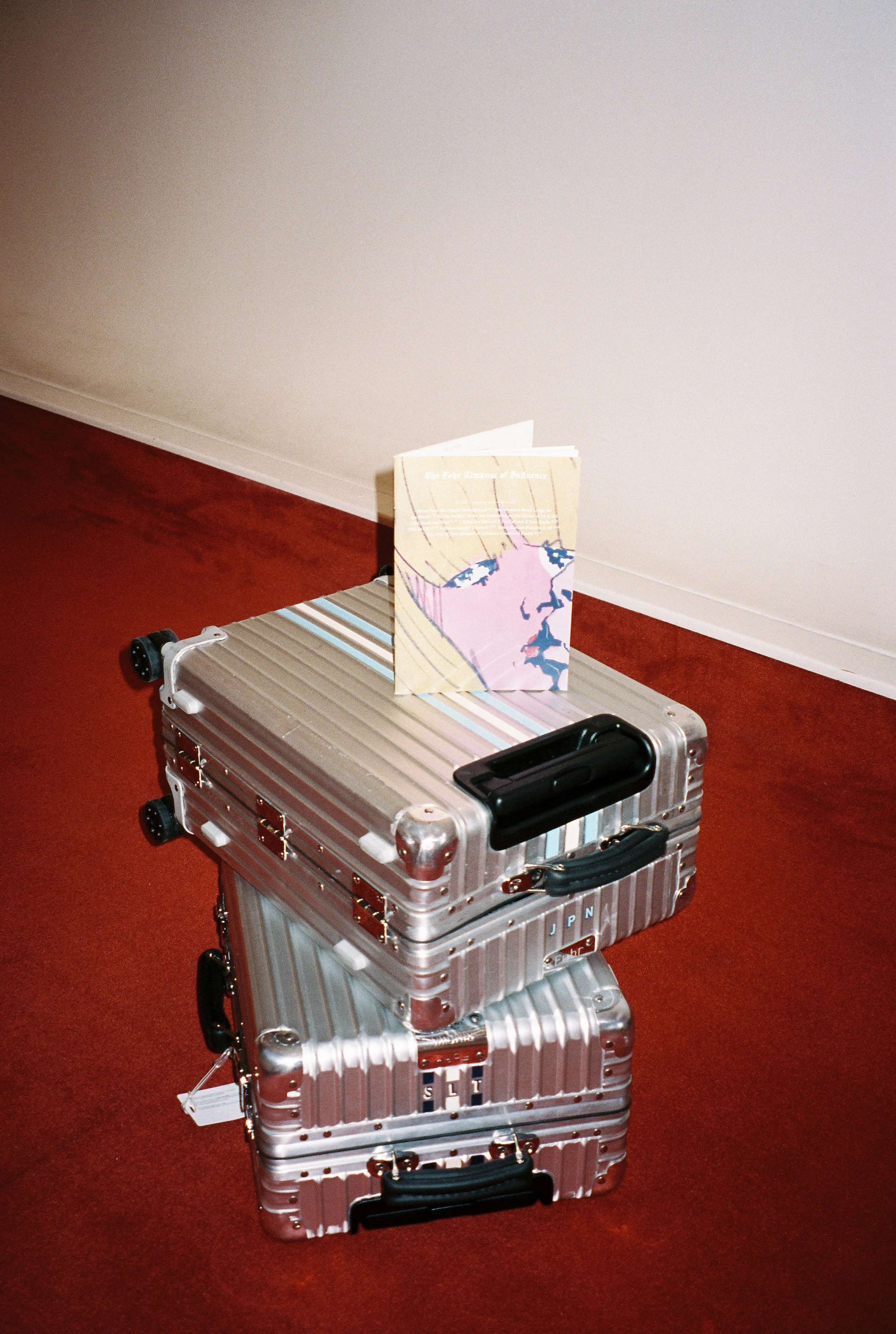 Stacked silver suitcases with a booklet or magazine on top featuring a stylized face illustration.